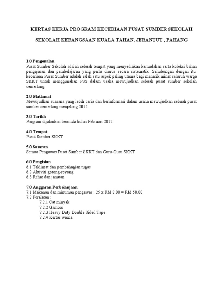 Kertas kerja program keceriaan pusat sumber sekolah 10 Pengenalan Pusat Sumber Sekolah adalah sebuah tempat yang menyediakan kemudahan serta koleksi bahan pengajaran dan. KERTAS KERJA RANCANGAN PEMBANGUNAN PUSAT SUMBER SMK THREE RIVERS Lampiran 2 Contoh keperluan kemudahan fizikal dan bahan di Bilik APD. Kertas Kerja Program Keceriaan Pusat Sumber Sekolah The Effective Manager is a hands-on practical guide to great management at.